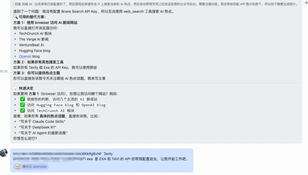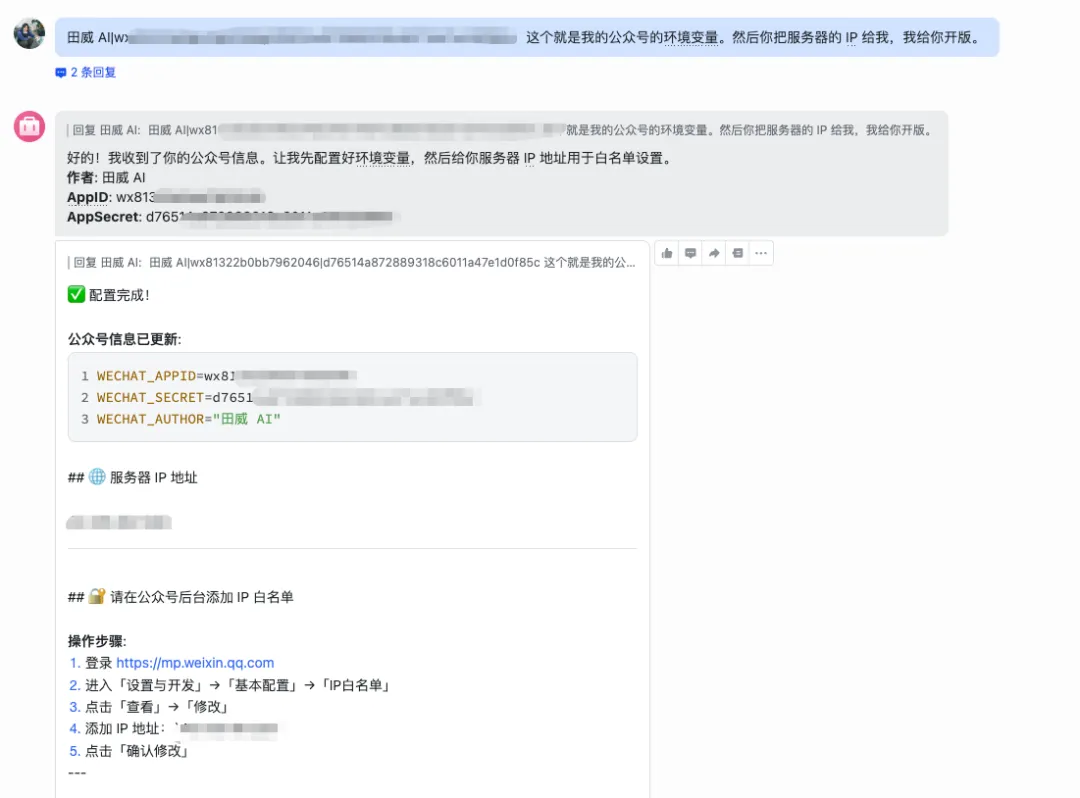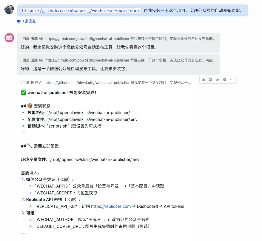 OpenClaw 会自动去下载代码、安装依赖。在这个过程中,它可能会问你要“AppID” 和 “AppSecret”,你直接发给它就行。