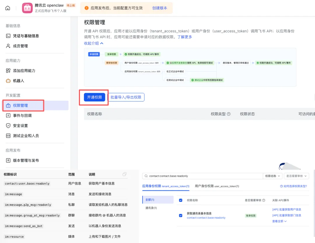 3.开通权限:在“权限管理”中,搜索并开通以下权限(这决定了它能干什么):