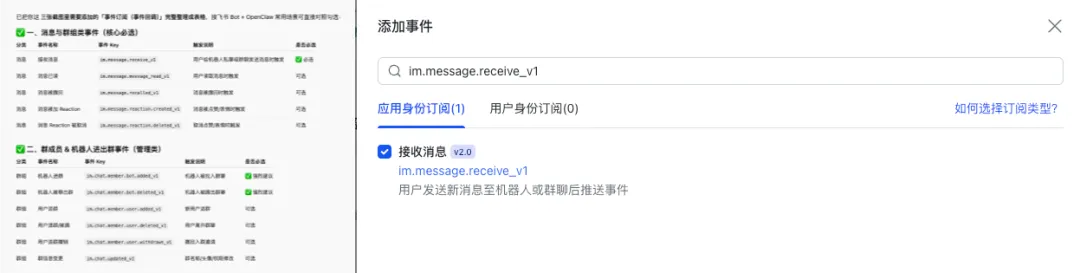 消息接收:im:message.p2p_msg:readonly (私聊), im:message.group_at_msg:readonly (群聊)